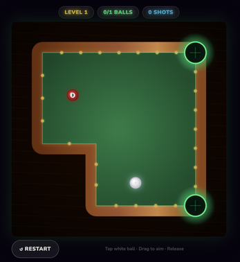 Control the white cue ball — drag to aim, release to shoot. Knock the coloured numbered balls into the glowing pocket(s) to clear each level. The white ball can never go in!